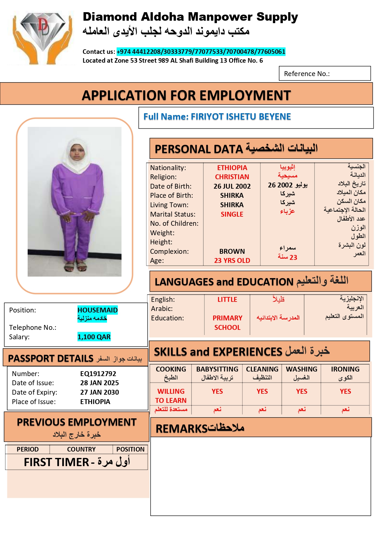 FIRIYOT BEYENE Domestic Worker – ETHIOPIA