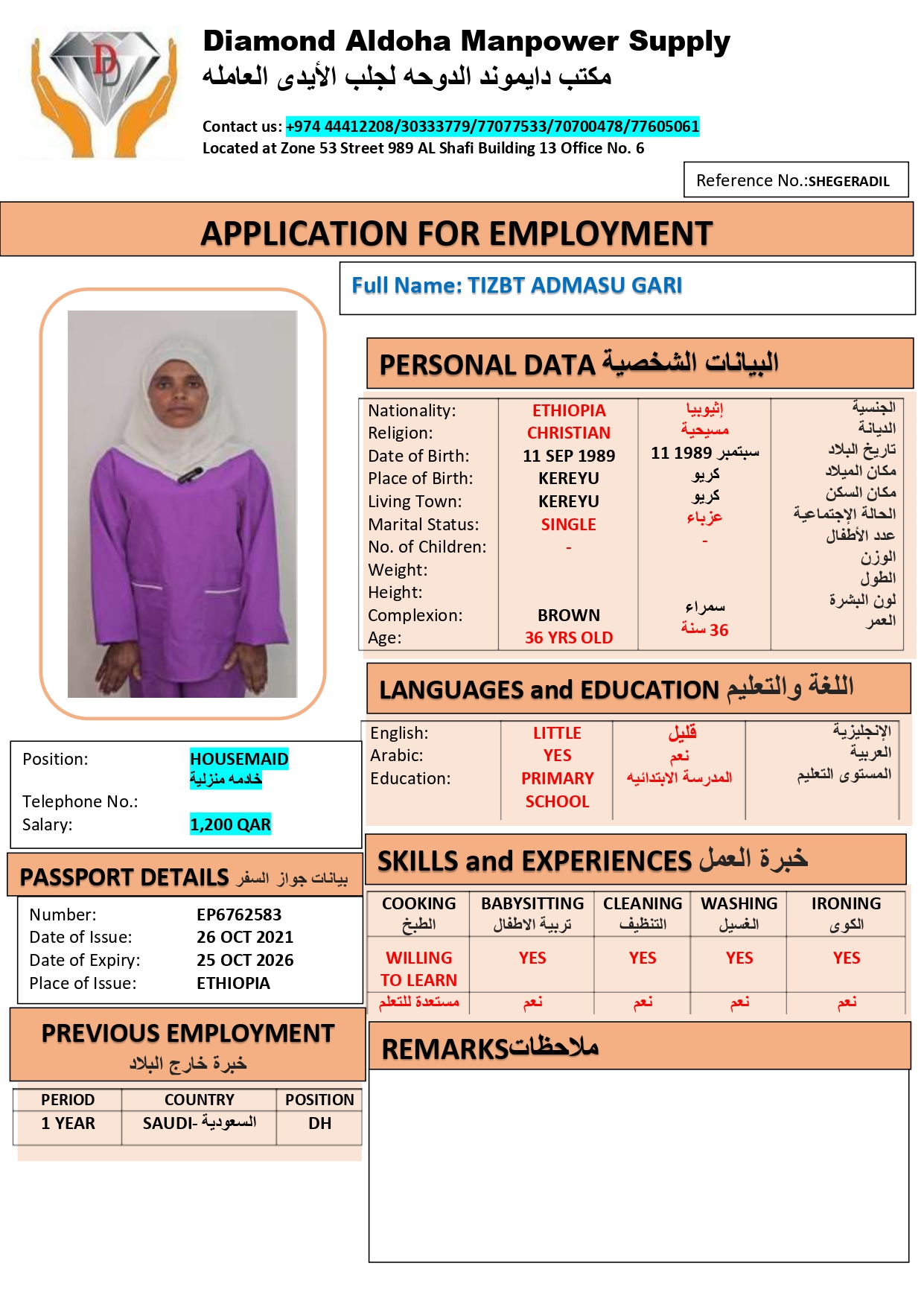 TIZBT GARI Domestic Worker – ETHIOPIA